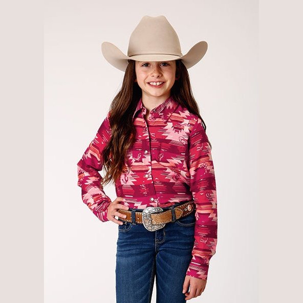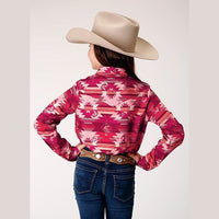 Girls will adore the iconic Aztec pattern and soft rayon texture of this chic western blouse, complete with long sleeves, pointed front and back yokes, open pockets, and snap closure, all delightfully garment-washed for unbeatable softness.