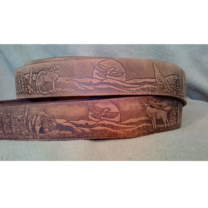 WILDLIFE EMBOSSED MENS BELT - BROWN WOLVES