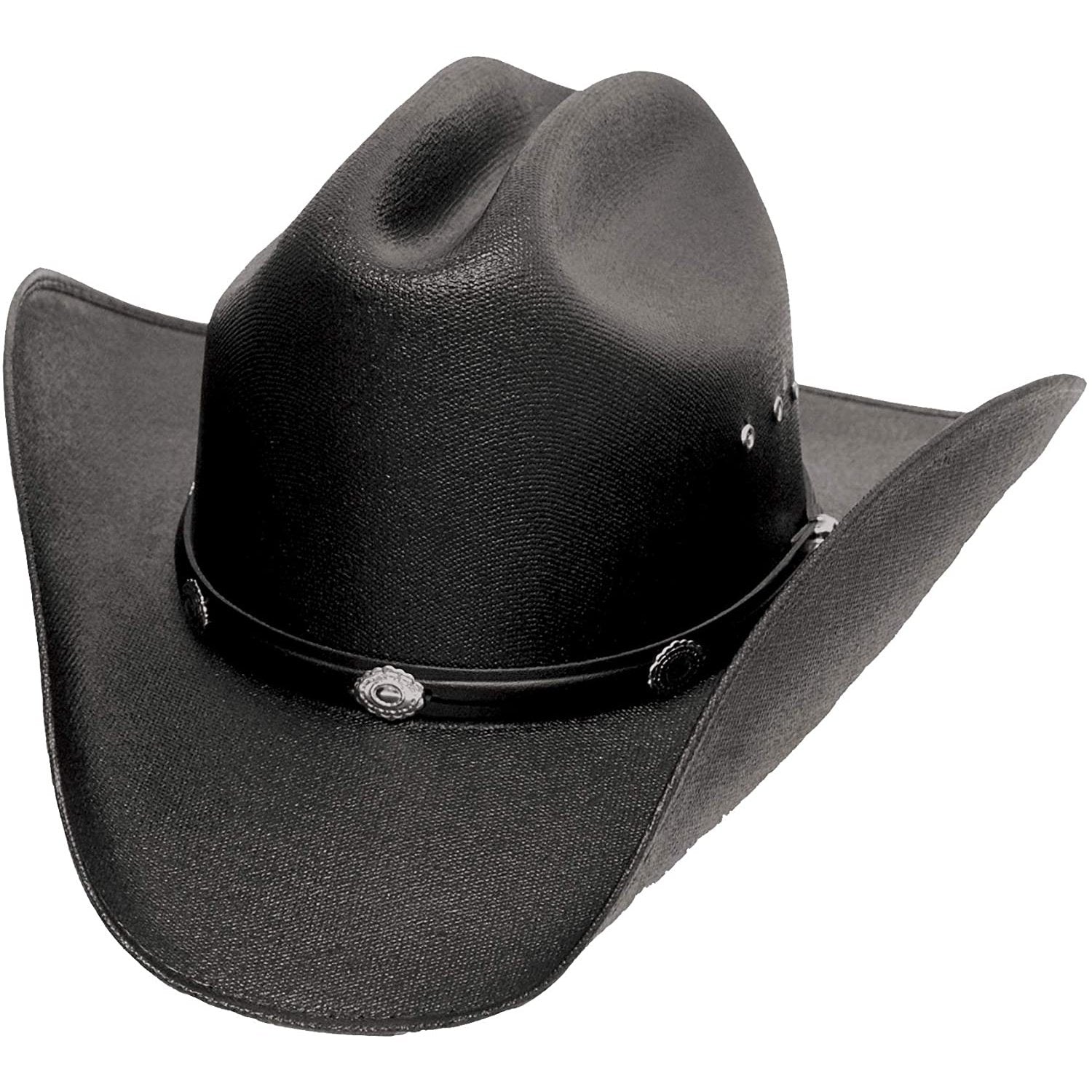- Black hatband is adorned with silver conchos