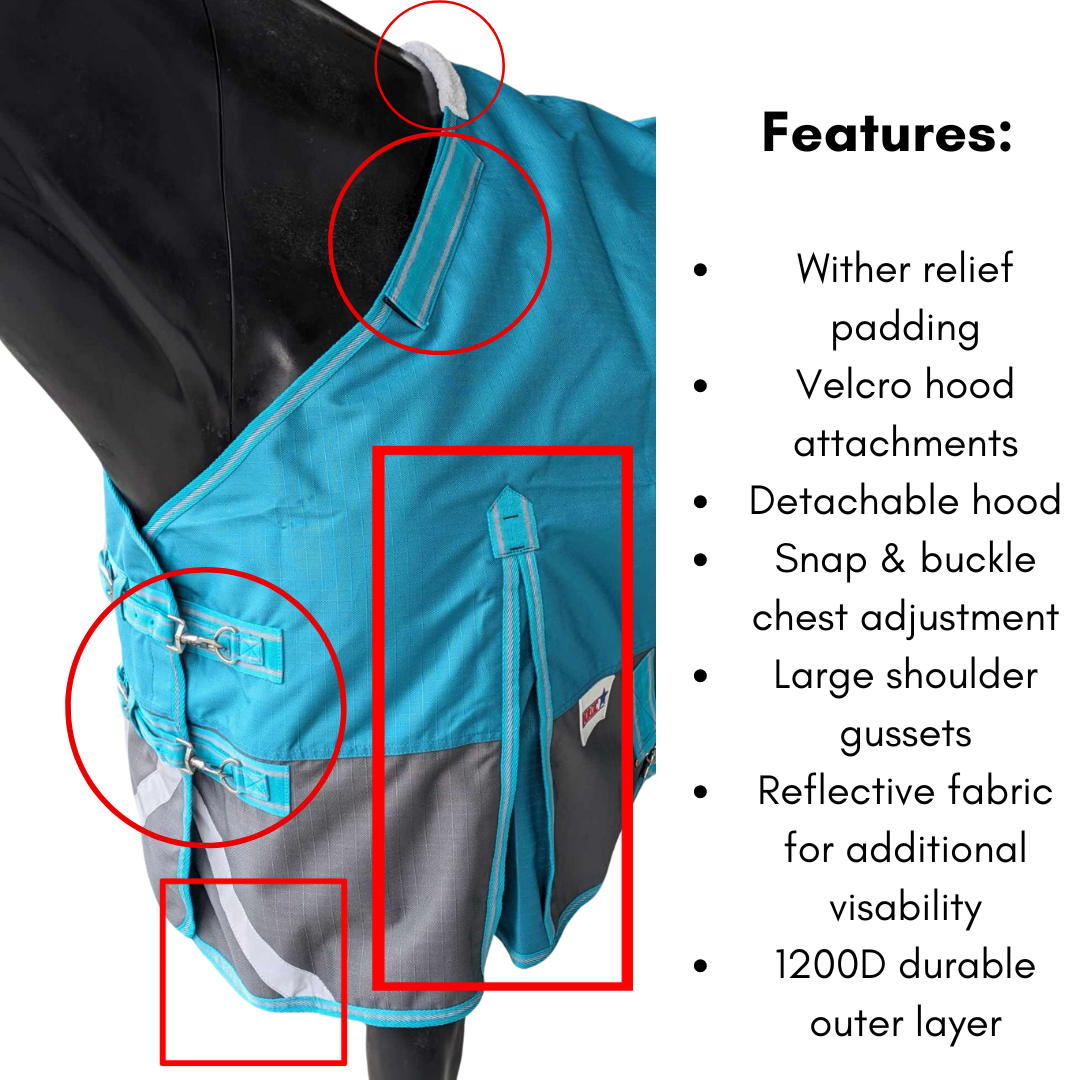 The 1200D Comfy Rain sheet with Detachable Neck by Nordic Star is an economical turnout option that offers total defense against the elements along with adjustability. The 1200 denier waterproof and breathable outer shell is woven in a grid pattern to prevent tearing and provide years of wear. With 0 grams of fill, this blanket is suitable for turnout when temps start to take a dive in the winter. Twin chest buckles and t-hook surcingles are quick and make for effortless on/off. Removable and adjustable leg straps make getting the perfect fit a cinch. Complete with a wide set tail flap and shoulder gusset, you can be sure your horse will be protected while preserving his freedom of movement. Comes with a detachable neck piece.