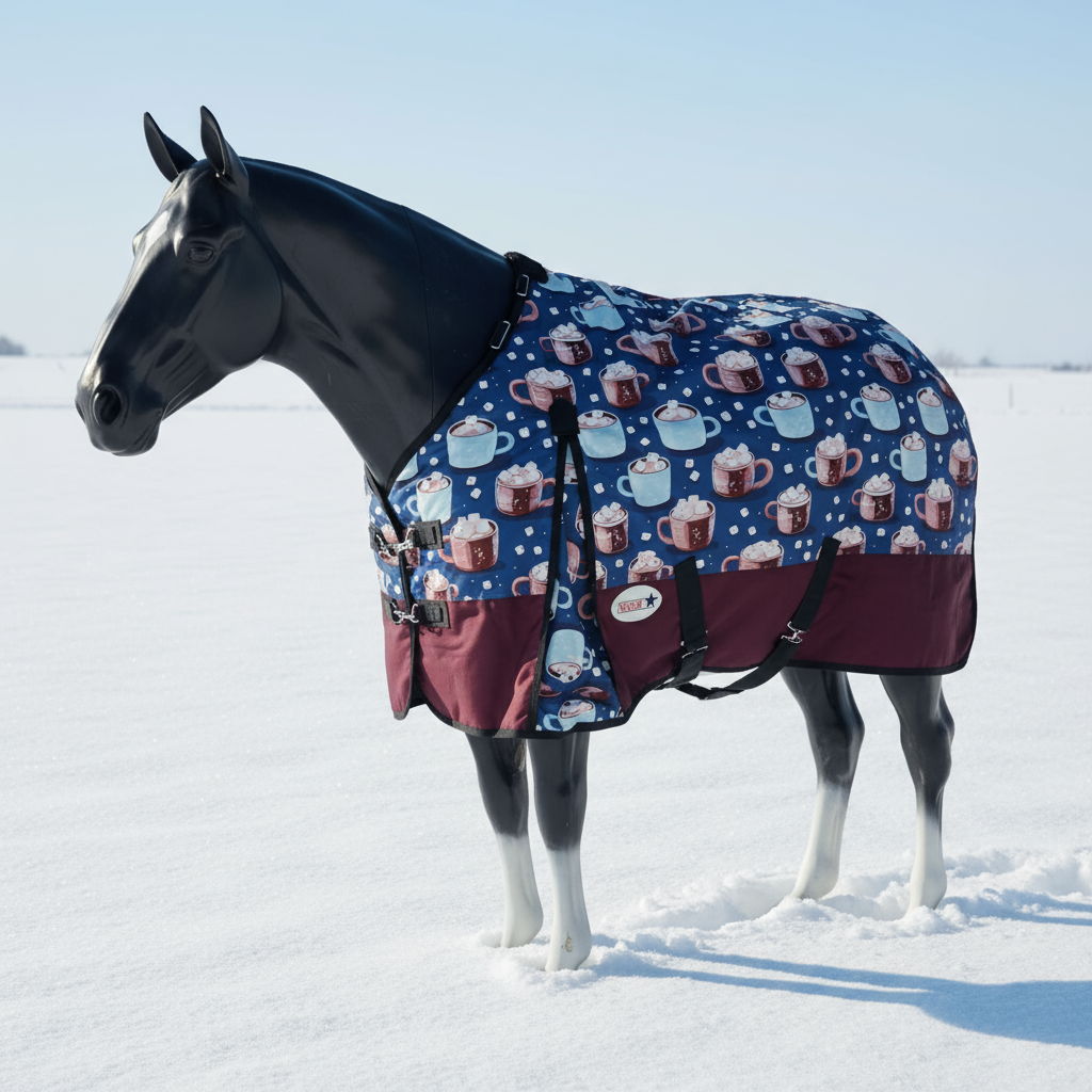 L'utilisation d'un tissu ripstop 1200 deniers de la plus haute qualité garantit une couverture d'extérieur d'une qualité exceptionnelle. Offrant un grand confort au niveau du poitrail et de l'encolure, cette couverture est dotée d'un extérieur imperméable et respirant, d'une encolure intégrée avec fermeture à boucle, d'une sangle de poitrail à boucle, de sursangles croisées réglables, d'un large rabat de queue, de soufflets latéraux et de sangles de cuisses élastiques et réglables pour une liberté de mouvement optimale.